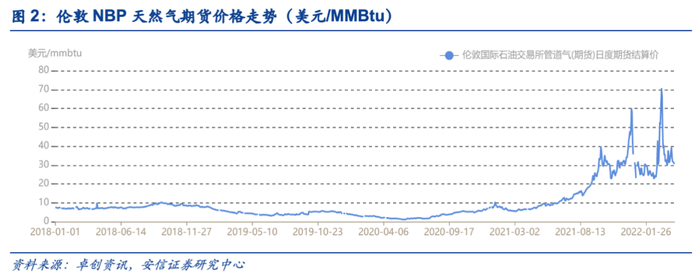 2021年以来欧洲天然气价格经历大幅度上涨。我们总结了从2018-2022年荷兰TTF以及伦敦NBP天然气管道价格,荷兰TTF天然气期货价格从2018-2020年走势相对平稳,2018年荷兰TTF价格在6.2-10.2美元/MMBtu之间浮动,假设按一百万英热单位(MMBtu)等于20.8kg、1美元兑6.5元人民币的汇率进行换算,对应价格区间为1937.62-3187.70元/吨。2019-2020年荷兰TTF价格持续下降,到2020年5月最低降至1.14美元/MMBtu,约为356.27元/吨。2021年以来荷兰TTF价格出现大幅度上涨,从年初的7.12美元/MMBtu(约2225.14元/吨)上涨至12月21日的最高点59.6美元/MMBtu(约18626.2元/吨),最大涨幅超过8倍。具体来看,2021年8月至10月,价格第一次加速上涨,从13.82美元/MMBtu(约4319.03元/吨)上涨至39.44美元/MMBtu(约12325.79元/吨),涨幅达到185%;价格第二次上涨在11月至12月,价格突破59.6美元/MMBtu(约18626.19元/吨),最大涨幅超两倍;2022年一季度欧洲天然气价格经历上下波动后再次上升至最高点,最高值为72.27美元/MMBtu(约22585.82元/吨)。截至2022年4月7日,荷兰TTF价格为33.34美元/MMBtu(约10419.42元/吨),同比上涨396.87%。