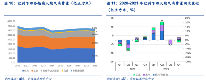 “碳中和”政策持续推进下,天然气作为能源转型的桥梁在欧洲能源结构中的占比稳步提升。据BP数据,2020年欧洲天然气消费量在能源总消费量占比达到25.25%,同比增加1.37个百分点,而石油和煤炭消费量分别下降2.48和1.16个百分点。虽然可再生能源发展迅速,但由于其发电的波动性和间歇性,天然气作为可兼具清洁、高效、稳定、低碳的能源仍具有不可替代性。从下游天然气消费结构看,欧洲的天然气需求主要集中在工业和住宅,两者占比超欧洲天然气总消费量的70%。