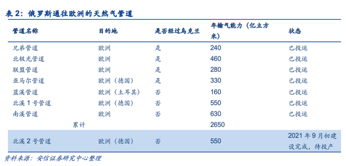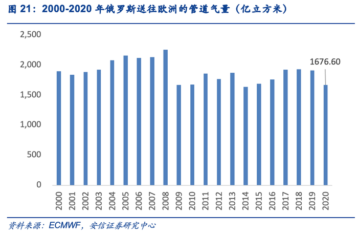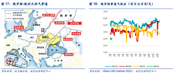 作为欧洲天然气最大供应来源,俄罗斯共建设7条通往欧洲的天然气管道线路,分别为:“兄弟”天然气管道、“北极光”天然气管道、“联盟”天然气管道、“亚马尔—欧洲”天然气管道、“蓝溪”天然气管道、“北溪”天然气管道、“南溪”天然气管道。俄罗斯通往欧洲的天然气管道累计输气能力为2650亿立方米/年,其中过境乌克兰的管道约占一半。根据国际能源署披露的数据,2021年第四季度,俄罗斯管道气出口同比下降近25%。主要原因是通过白俄罗斯和乌克兰的管道出口量的减少。但2021年总体而言,俄罗斯对欧洲的管道出口仍同比增长4%,主要是流向土耳其(同比增长60%以上),而对欧盟的管道出口同比下降3%。同时根据壳牌发布的2022前景报告,2022年初俄罗斯管道气供应量甚至低于2019-2021年同期供应量,全年供应量可能将持续走低。