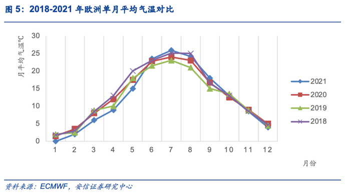 2021年年初至10月初欧洲天然气价持续上涨,主要受到极端天气影响。由于2021年年初欧洲受到极寒天气的影响,导致了大范围停电,同时天然气基础设施遭遇破坏,造成天然气产量下滑。根据海外气象局统计的数据,2021年1-5月欧洲平均气温均低于2018-2020年同期气温水平,尤其在3-5月欧洲平均气温相比2020年同期分别降低2℃、3.1℃和2.5℃,低气温激发了用电需求的增长。而 2021年夏季欧洲出现持续高温干旱天气,进一步推动天然气发电需求增长,天然气价格从而出现“淡季不淡”的情形,价格持续保持高位。