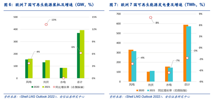 2021年欧洲整体风资源相对较差,可再生能源发电量不及预期,进一步加大对天然气发电的依赖。在“碳中和”驱动下,欧洲可再生能源装机量持续增加,根据壳牌数据,欧洲7个国家(德国、荷兰、西班牙、法国、比利时、意大利、英国)2021年可再生能源装机量较去年同比增加6%,其中风电和光伏分别同比增长4%和13%,但整体发电量较去年同比减少3%,其中风电和水电分别同比下降4%和7%。可再生能源出力不佳,主要受2021年气候异常影响,北海整体夏秋季风力不足,风电出力明显下降。此外,挪威来水不够导致水电出力下降。虽然太阳能发电量2021年较去年有所上升,但受季节性影响,冬季发电量偏低,且具有波动性和间歇性,因此导致2021年欧洲天然气发电需求高于预期。