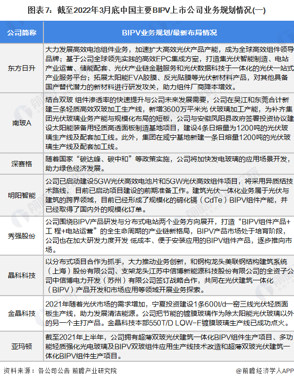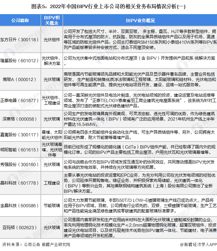BIPV行业主要上市公司:东方日升(300118)、隆基股份(601012)、正泰电器(601877)、深赛格(00008)、秀强股份(300160)、亚玛顿(002623)、金晶科技(600586)、晶科科技(601778)、杭萧钢构(600477)、天合光能(688599)、森特股份(603098)和东南网架(002135)等。