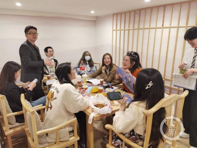 4月10日下午,上游新闻记者来到位于南坪万达广场的一家剧本杀馆。刚到馆里,就刚好遇到8名玩家(2男6女)准备体验杀猪盘剧本杀——《杀猪》。