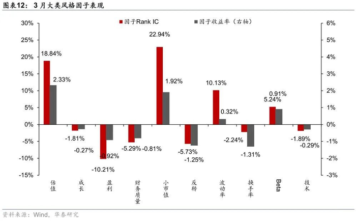 大类风格因子3月在全A股票池的Rank IC值和因子收益率如下图所示。估值、小市值和波动率因子表现良好,Rank IC均超过10%;Beta因子的Rank IC和因子收益率均呈现正向。成长、盈利、财务质量、反转、换手率、技术等其余因子均出现回撤。