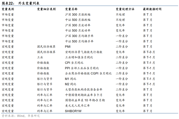 时间序列回归模型的一个重要前提是自变量为平稳时间序列,而大部分宏观指标和市场指标在时间序列上的分布非平稳,不符合预测模型对自变量的假设,因此我们针对不同的外生变量,进行一定差分处理或计算变化率,使得外生变量在单位根检验下均为平稳时间序列。另外,部分宏观变量数据发布具有滞后性,我们在建模时将这部分宏观数据按其实际发布时间滞后使用。例如,T-1月的M1同比数据通常在T月中旬公布,因此我们在T月末建模时用到的是T-1月的M1同比数据。