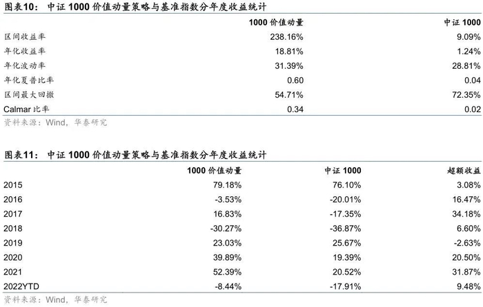 结合本文判断,短期内生、外生等多重逻辑均相对看好估值因子。参考华泰金工发布的报告《价值策略表现分析与结合动量的优化》(2021.8.13)中的分析结论,结合动量因子能够对价值策略起到较好的增强效果。本文在中证800和中证1000等不同市值风格的指数成分股票池中对策略进行跟踪,策略均表现出理想的风险调整收益与回撤控制水平,相对基准胜率较高。今年以来,中证800内的价值动量策略取得7.85%的超额收益,中证1000内的策略取得9.48%的超额收益。在价值风格利好的场景下,策略能够提供一定的参考价值。