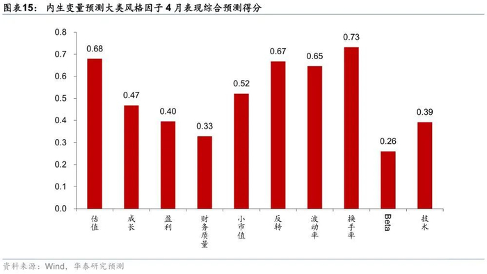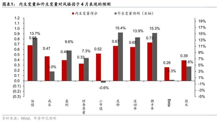 综合内生变量、外生变量、因子周期与日历效应等视角,4月看好估值以及波动率、换手率、反转等量价类因子。内生变量视角短期看好换手率、反转、估值、波动率因子,不看好财务质量、Beta、技术因子。外生变量视角看好估值、反转、换手率、波动率因子,不看好小市值因子。因子周期视角中期看好估值、小市值、反转、技术因子,长期看好小市值、反转、技术、波动率、换手率因子。日历效应4月看好波动率、换手率、财务质量因子。
