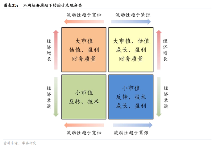对因子周期的研究发现,大部分因子的中长期走势与经济形势挂钩,影响较为明显的两个因素是经济增长和流动性,前者可使用库兹涅茨周期刻画,后者可使用朱格拉周期辅助判断。我们借助这两个变量将经济环境分为四种情况,不同经济周期下因子表现分类如下图所示,称之为因子投资时钟。因子投资时钟的详细构建方法请参考华泰金工研究报告《周期视角下的因子投资时钟》(20181011)。