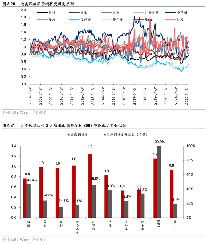 从截面角度看,小市值和Beta因子拥挤度相对较高,波动率和换手率因子拥挤度相对较低。从时序角度看,Beta和技术因子拥挤度处于2007年以来最高水平,可能处于交易拥挤状态;盈利、财务质量和技术因子拥挤度低于2007年以来的20%以下的历史分位数水平,交易相对不拥挤。