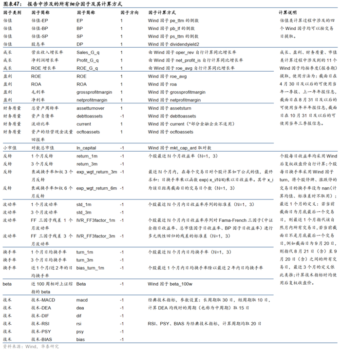 上表第四列因子方向解释:取值为1代表因子值越大越好,-1代表因子值越小越好。当采用等权法合成风格因子时,需将因子值乘以因子方向之后再相加。