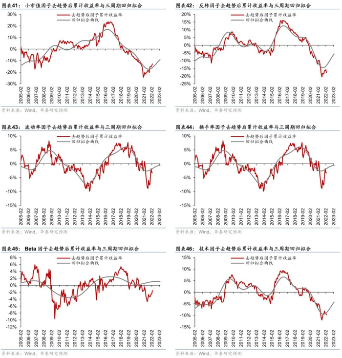 下面展示各个大类风格因子三周期回归拟合结果。三周期回归拟合详细方法请参考华泰金工研究报告《因子收益率的周期性研究初探》(20180605)。图中红线为去趋势后因子累计收益率,灰线为回归拟合曲线,灰线相对红线的延伸部分为因子未来一年表现边际变化情况预测。综合来看,估值、小市值、反转、技术因子处于上行轨道;盈利、财务质量因子已经处于下行周期末端;成长因子从底部进入回升阶段;波动率、换手率因子上行趋缓,可能接近顶部;Beta因子由顶部进入下行区间。