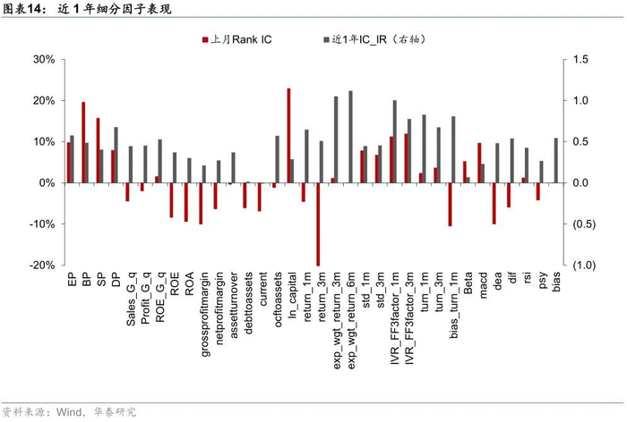 计算34个细分因子3月Rank IC值,以及近12个月的月频Rank IC值。将近12个月Rank IC的均值除以标准差,得到近1年IC_IR。近期细分因子表现如下图所示。