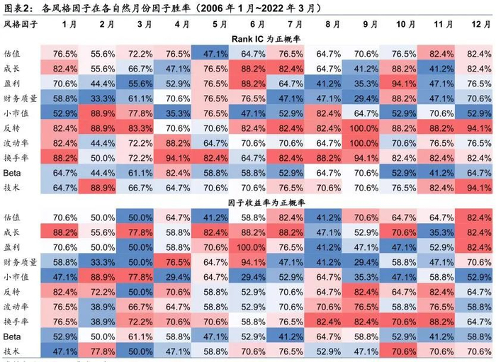 进一步观察各风格因子在各自然月份胜率,根据历史经验,4月波动率、换手率、Beta因子Rank IC为正概率较高;财务质量、反转、换手率因子收益率为正概率较高。通过加总的方式综合来看,波动率、换手率、财务质量因子4月相对较优,小市值因子胜率较低。