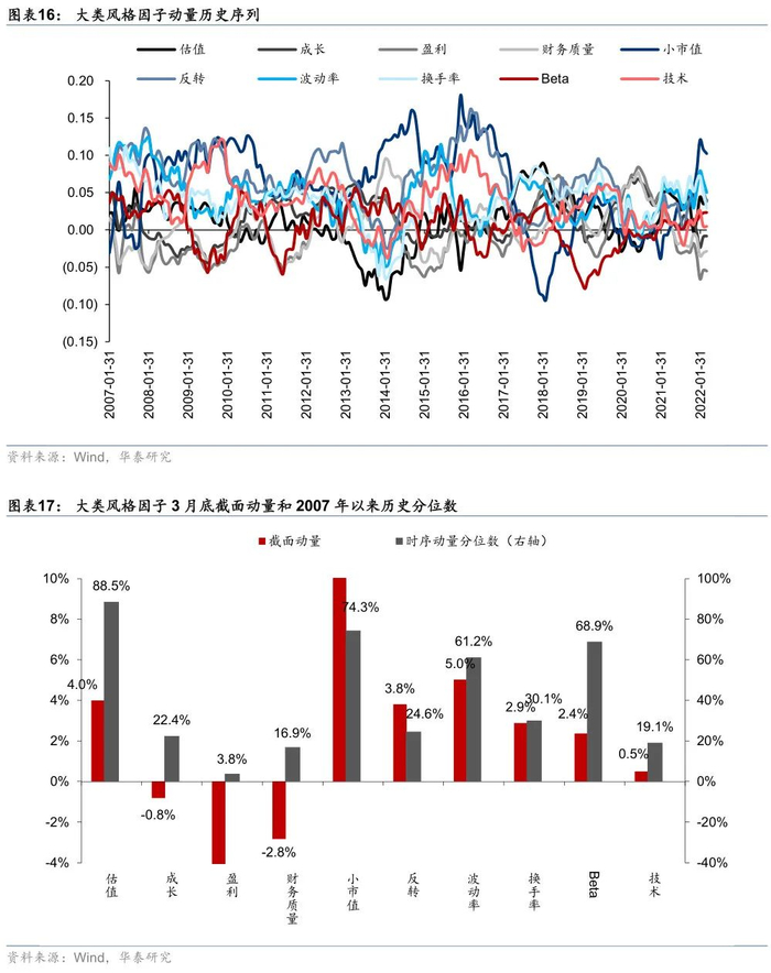 定义因子动量为因子在过去12个月末截面期的21日Rank IC均值。从截面角度看,小市值、波动率、反转、估值因子动量较强,成长、盈利、财务质量因子动量较弱。从时序角度看,估值因子动量处于历史高位,超过2007年以来的80%分位数水平;财务质量和技术因子动量处于历史低位,在2007年以来的20%分位数水平附近。