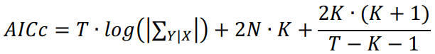 当样本数量较小时,基于AIC的方法可能会产生模型过拟合问题。为避免此问题,研究者提出AICc指标,在AIC上添加小样本误差修正量。基于条件期望模型的AICc计算公式如下: