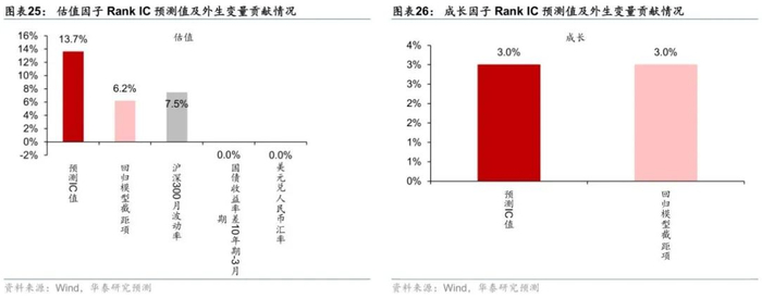 1. 估值因子:Rank IC预测值为13.7%。沪深300当月波动率变化率较前值下降8.19pct,为Rank IC预测值提供7.5%的正向贡献,是影响该因子Rank IC预测值的主要因素;此外回归模型截距项为6.2%,表明因子存在长期正收益。
