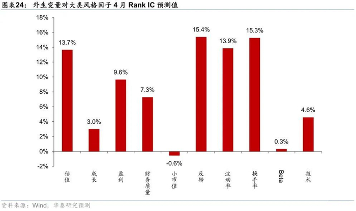 外生变量对大类风格因子4月Rank IC预测结果如下图所示。估值、反转、换手率、波动率因子Rank IC预测值超过10%,可能较为有效,建议短期看多上述因子表现;不看好小市值因子未来一个月的表现,该因子表现可能受宏观环境制约。