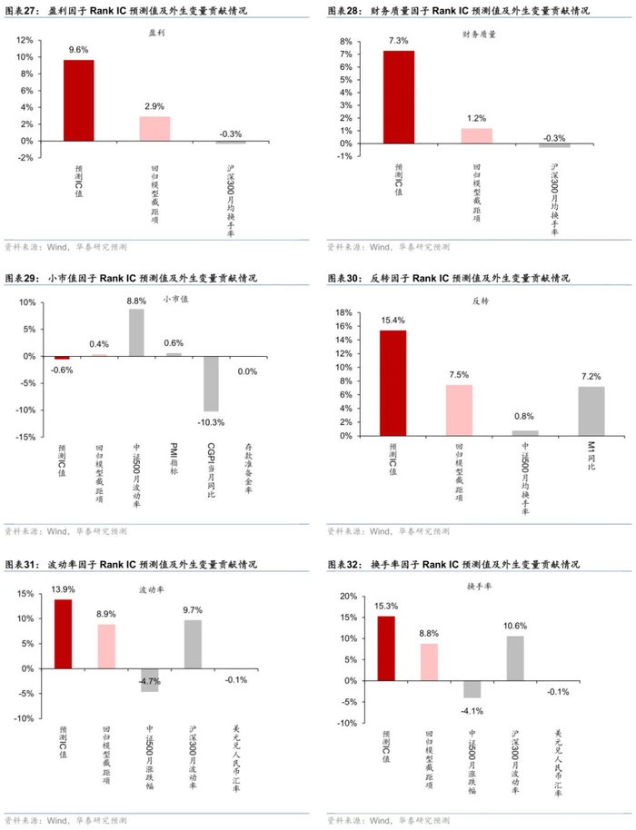 4. 换手率因子:Rank IC预测值为15.3%,其中回归模型截距项为8.8%,表明换手率因子长期存在正收益;沪深300当月波动率变化率较前值提升8.19pct,为Rank IC预测值提供10.6%的正向贡献;中证500月涨跌幅较前值下降11.74pct,为Rank IC预测值提供4.1%的负向贡献。