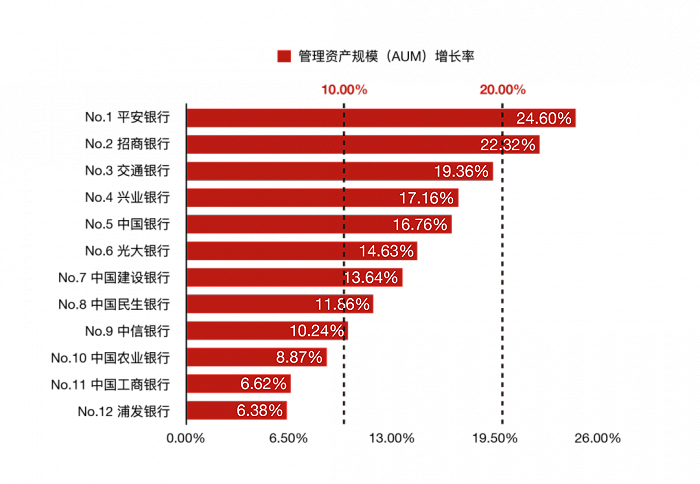 首先,处于最高增幅区的是增幅超过20%的平安私人银行(24.60%)和招商银行私人银行(22.32%),由此可见平安私人银行“弯道超车”的战略正在见效。