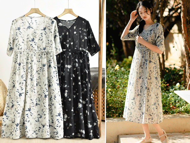 苎麻碎花连衣裙,宽松藏肉,自在凉爽,印花清新雅致,摆脱了基础款的单调感。