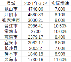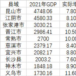 第一财经记者梳理了各经济强县2021年GDP数据后发现,2021年我国GDP十强县分别是昆山、江阴、张家港、晋江、常熟、慈溪、宜兴、长沙县、神木和义乌。其中,昆山连续18年居第一,张家港GDP首次突破3000亿元;另外,西部的神木时隔数年后再度进入前十行列。