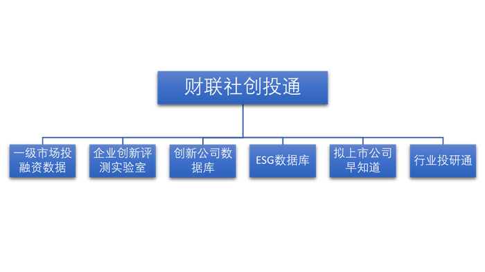 “财联社创投通”数据产品目前标准化主要分为六大板块:一级市场投融资数据、企业创新评测实验室、创新公司数据库、ESG数据库、拟上市公司早知道和行业投研通,未来还将根据市场需求,不断丰富产品体系,具体如下: