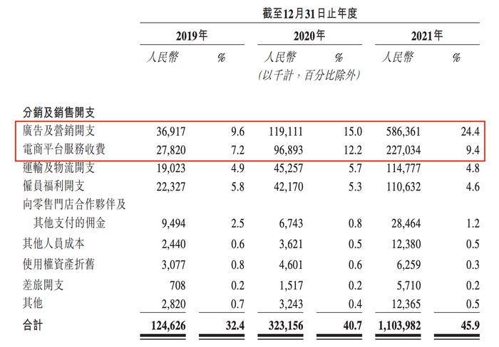其中,仅广告一项支出2021年就花掉了5.86亿元,占当年总收入的24.4%,而电商平台的服务收费则达2.27亿,给主播的坑位费占去一年营收的近10%,而在2020年这一比例甚至达到12.2%。