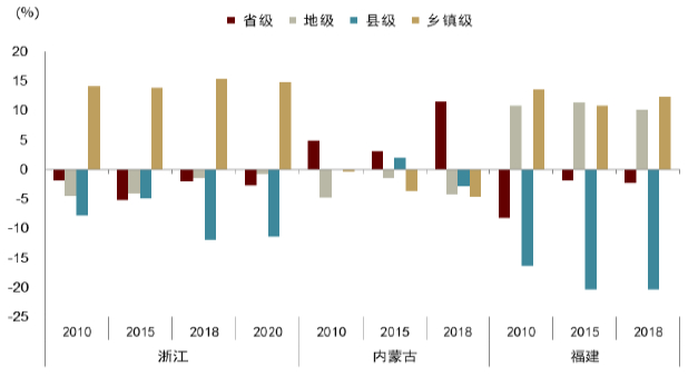 资料来源:各省财政年鉴,中金公司研究部。注:财权事权不匹配程度的衡量方法为该省一般预算账户中本级财政收入占比与本级财政支出占比的差。