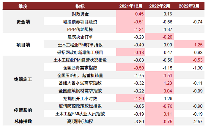 资料来源:万得资讯,卓创资讯,钢联,采招网,中采协会,中金公司研究部。注:以上月度指标均经过标准化处理,高频基建跟踪指数包括城投债项目融资、土木工程业PMI分项、水泥沥青建筑钢材需求指数(为开工率与库存拟合,同时建筑钢材因无法分离地产与基建影响而权重减半)、疫情防控指数。