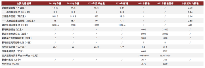 我们在此前的《基建和绿色投资能否对冲地产回落?》报告中对今年广义基建发力领域进行了判断。相对而言,电力的生产和供应(包含电源与电网建设)、轨道交通、水利、高速公路等投资增速相对靠前。结合部委最新信息,我们将已明确今年建设目标的行业汇总如下,这其中值得注意的是,随着城市化进程放缓基建空间面临趋势性收窄,这从十四五新增目标即可看出,但不排除各领域在十四五期间投资进度提前的可能,进而今年基建增速不低: