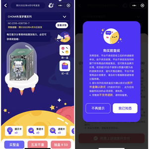 4月11日,记者进入盲盒星球小程序体验在线抽盒时发现,在抽盒初始页面上并没有“拆盒未拆袋”的标注。点击抽盒时,页面会弹出“购买前查阅”对话框,提示“部分系列在线拆盒后确认款式会拆开外盒确认款式(内袋未开封),此为在线抽盒机玩法的必须流程,请知悉。”