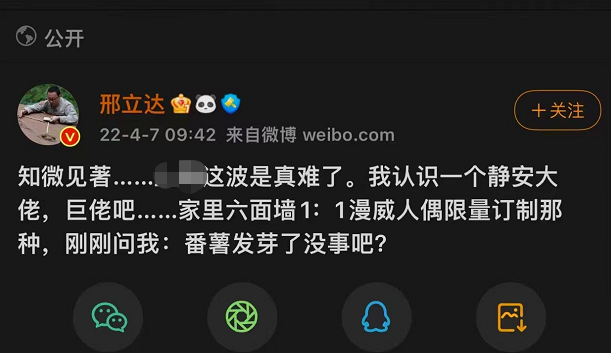 你看,家中六面墙1:1限量定制漫威人偶的大佬,他居然询问:番薯发芽了能不能吃?
