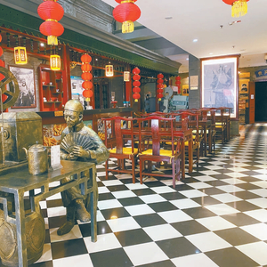 走进影院大堂,大红灯笼、红木桌椅、青砖墙面、黑白格地砖等一应陈设全是民国风格,要不是柜台前屏幕上显示的放映信息,还真容易让人以为这是一家茶馆。而沿着墙面陈列的一系列图片、文字介绍以及玻璃柜中展示的各种电影相关展品,则又让人觉得这是一家电影主题的博物馆。
