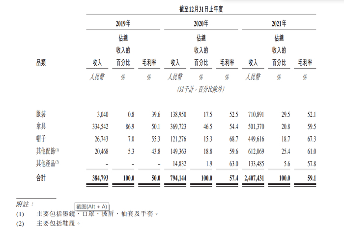 蕉下于2012年成立,以防晒伞产品起家,通过了双层小黑伞、胶囊伞系列获得了知名度。在防晒伞取得成功后,蕉下紧随其后,迅速拓展了服装、防晒口罩、鞋履等其他品类。品类的扩张也带动了整体毛利率的提高。2019年到2021年的毛利率分别为50%、57.4%、59.1%。