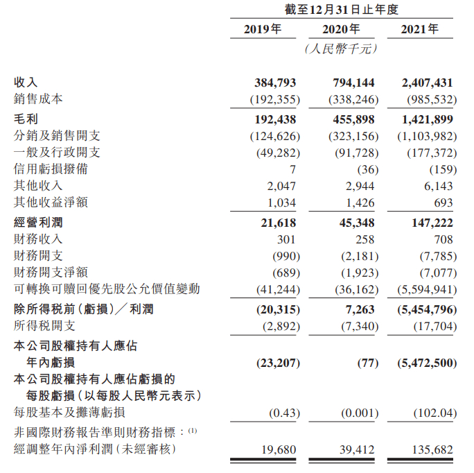 最终经营利润分别为0.22亿元、0.45亿元、1.47亿元;2021年除所得税前的亏损为54.5亿元,主要是由于可转换可赎回的优先股公允价值变动带来55.95亿元亏损所致。非国际财务报告准则下,经调整年内净利润分别为0.20亿元、0.39亿元、1.35亿元。