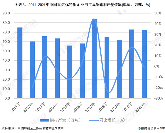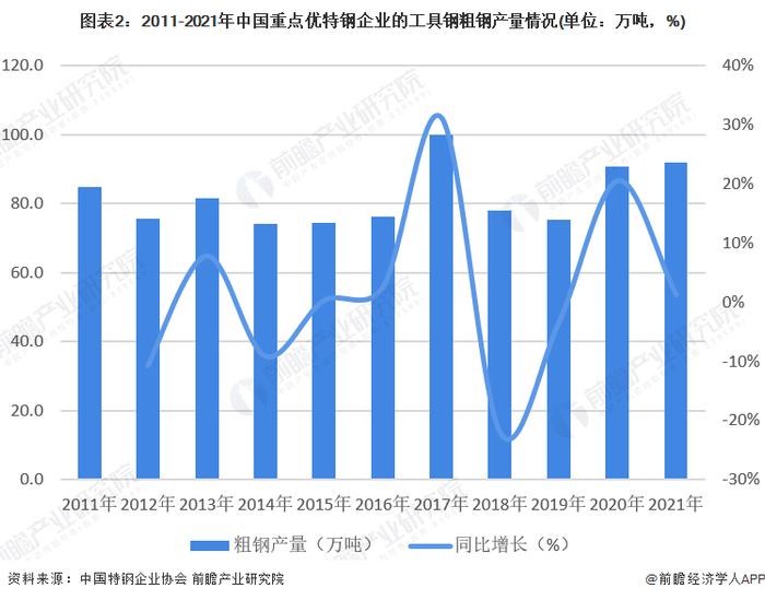 根据中国特钢企业协会的统计数据,2011-2021年,中国重点优特钢企业的工具钢粗钢产量呈现波动变化态势,2017年达到最高的100万吨,2021年全国重点优特钢企业的工具钢粗钢产量约92万吨,同比增长1%。