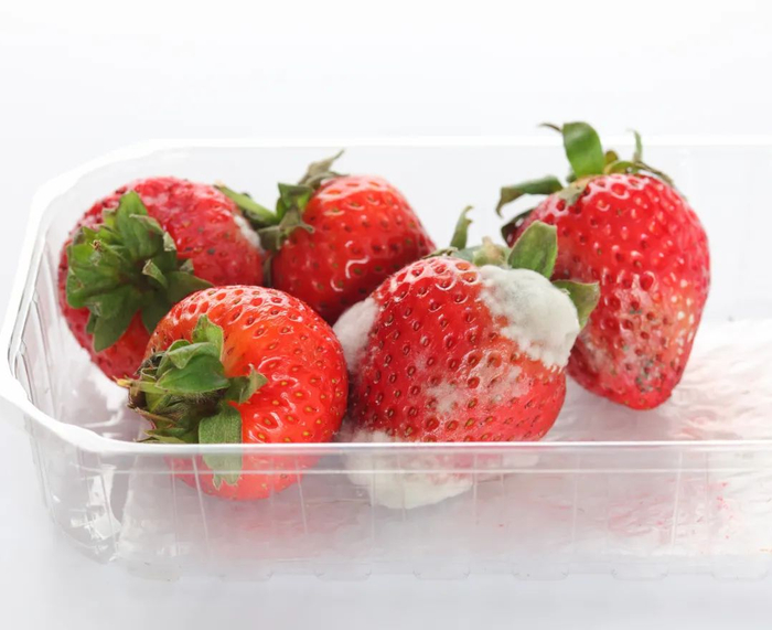也就是说,看起来没有腐烂并不代表没有被霉菌及其毒素污染,所以发霉的水果就不要吃了。而且发霉水果附近的水果也可能会受到看不见的污染(比如下面的草莓),也不要吃啦。