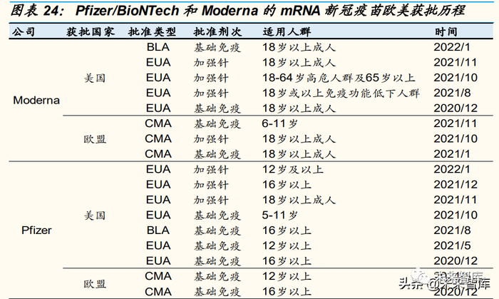 21 年 8 月,Pfizer/BioNTech 的 mRNA 新冠疫苗(Comirnaty)首次获得美 国 FDA 全面批准上市,用于预防 16 岁及以上人群的 COVID-19 疾病。此 后,Moderna mRNA 新冠疫苗(SPIKEVA)的生物制剂许可申请(BLA) 也于 22 年 1 月获得 FDA 批准,以预防 18 岁及以上个体的 COVID-19。