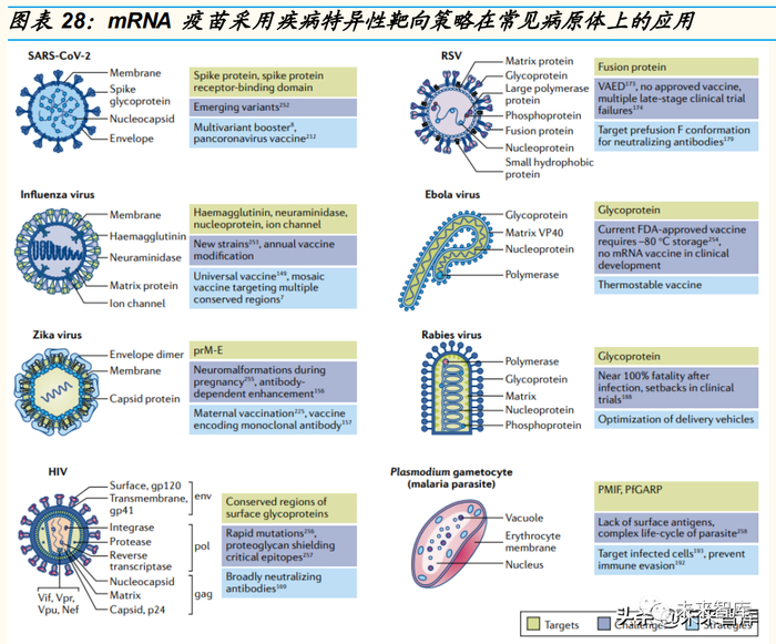 传染病疫苗是目前最先进的 mRNA 技术应用。mRNA 疫苗通常使用能够 进入细胞的表面蛋白来靶向病毒,例如新冠病毒(SARS-CoV-2)的刺突 蛋白,流感病毒的血凝素蛋白,寨卡病毒的膜和包膜蛋白(prM-E),呼吸 道合胞病毒(RSV)的融合蛋白和人类免疫缺陷病毒(HIV),埃博拉病毒 和狂犬病病毒的表面糖蛋白。每种病原体都具有各自独特的挑战,包括高 致死性,快速突变,免疫逃逸,毒株变异等。编码构象特异性蛋白、抗原 保守区域或单克隆抗体的 mRNA 疫苗可以安全地输送给健康的成年人、儿 童、老年人和孕妇。