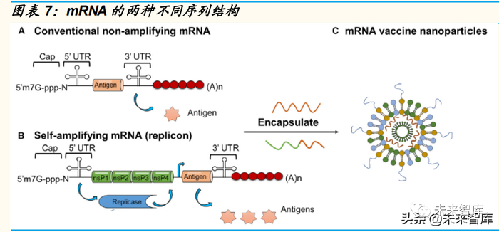 目前,mRNA 疫苗主要以两种序列结构存在,传统的非复制型 mRNA 序列 和自扩增型的 mRNA 疫苗序列。自扩增型 mRNA 序列含有复制酶基因, 可在细胞内扩增 mRNA,从而以较少的 mRNA 剂量生产较多的抗原。非复 制型的 mRNA 疫苗结构简单,在人体内无法自我复制,需要成熟的优化工 艺才能在较低的剂量诱发有效的免疫应答。