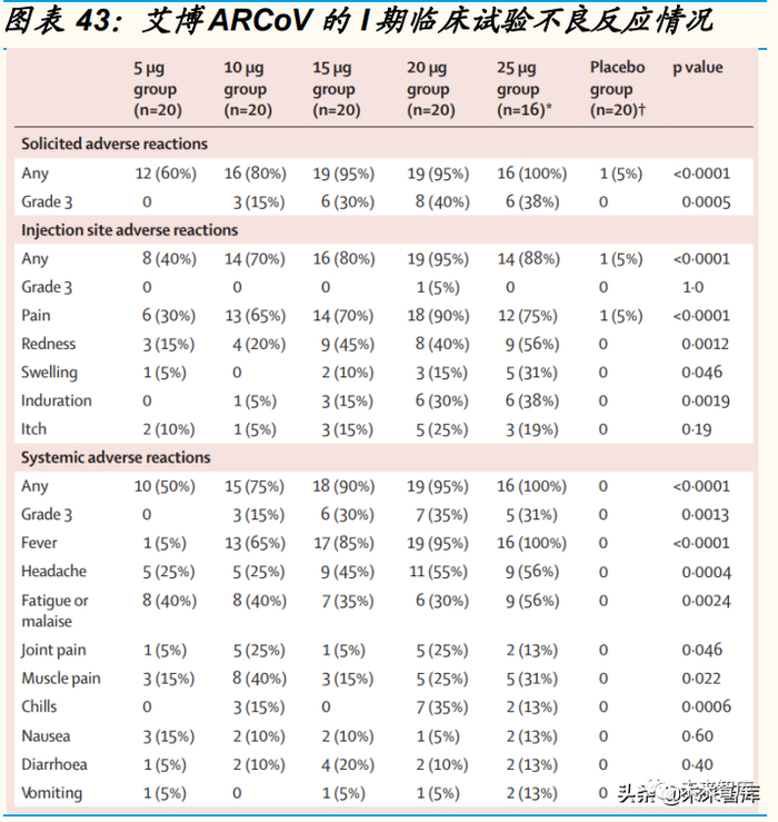 22 年 1 月,艾博生物与军事科学院军事医学研究院、沃森生物共同研制的 新冠 mRNA 疫苗 ARCoVaX(ARCoV)疫苗 I 期临床试验结果在柳叶刀子 刊《Lancet Microbe》刊登。I 期临床试验结果显示,ARCoV 在 5ug、 10ug、15ug、20ug、25ug 等 5 种不同剂量下均安全性和耐受性良好,且 能够诱导强烈的体液和细胞免疫反应,其中 15ug 试验组诱导的中和抗体 滴度最高,约为 COVID-19 康复期患者的 2 倍。安全性方面,接种后 56 天内无严重不良事件报告,大多数不良事件为轻度或中度。发热是最常见 的系统性不良反应:5ug、10ug、15ug、20ug、25ug 组的比例分别为 5%、 65%、85%、95%和 100%。