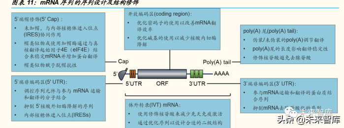 作为外源的核酸物质,mRNA 进入人体内后容易被免疫系统识别,被核酸 酶降解。为保证 mRNA 疫苗的稳定性和免疫活性,需要对 mRNA 序列进 行优化设计。传统的非复制型 mRNA 序列由五部分构成,包括 5’端帽、5’ 端非编码区、开放编码区、3’端非编码区和 poly(A)尾结构。目前主要的 mRNA 修饰技术主要包括: