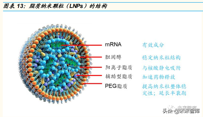脂质纳米颗粒(LNPs) 是目前最先进的递送系统,mRNA 处于 LNP 的核心 位臵,不易被核酸酶降解,且 LNP 的亲脂性使其易与宿主细胞膜融合,进 而以内吞的方式将 mRNA 传递至细胞内。典型的脂质纳米颗粒(LNPs) 由四种成分组成:①可电离的阳离子脂质:通过促进自组装成病毒大小 (~100nm)的颗粒,并允许 mRNA 释放到细胞质中;②与脂质相连的聚 乙二醇(PEG):增加制剂的半衰期;③胆固醇:稳定剂;④天然磷脂:支 持脂质双层结构。在早期的研究中,LNP 的安全性已在 siRNA 的传递中得 以证明,新冠疫苗的大规模临床试验和接种应用也成功表明了 LNP 递送载 体的安全性和递呈效果。