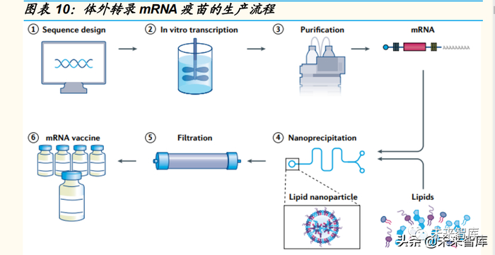序列设计和递送系统是 mRNA 疫苗生产过程中最重要的环节。mRNA 疫 苗的生产流程主要可分为六步:①序列设计:根据病原体的基因组进行抗 原序列的设计和优化,并将其插入质粒 DNA 中;②体外转录:质粒 DNA 在体外通过噬菌体 RNA 聚合酶转录出 mRNA;③纯化:将 mRNA 通过高 效液相色谱(HPLC)纯化以去除污染物和其它反应物;④纳米沉淀:将 纯化的 mRNA 与脂质在微流体混合器中混合,形成脂质纳米颗粒(LNPs), 快速混合使脂质瞬间包裹 mRNA,并沉淀为自组装纳米粒子;⑤筛选:透析或过滤纳米颗粒溶液,从而去除非水溶剂和任何未封装的 mRNA;⑥疫 苗制备:过滤后的 mRNA 疫苗溶液被储存在无菌小瓶中。
