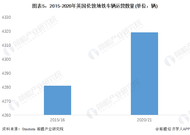 2015-2020年,英国伦敦地铁车辆数总量变化不大。2015/16年英国伦敦地铁车辆数为4281辆,2020/21年地铁车辆数上升至4319。