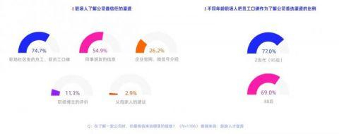 《报告》数据显示,74.7%的职场人最相信“职场社区里的员工、前员工口碑”评价,“同事朋友的信息”也是他们认为的比较可靠的信息来源。但相比于80后,Z世代更加信任员工口碑。工作1-3年的职场人中,将近八成将社区员工口碑作为了解公司最信赖的渠道,通过社区主动对企业进行“反向背调”。而在80后职场人里,这一比例只占不到70%。