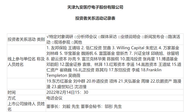 虽然业绩和股价双涨,但目前市场并未看到专门针对九安医疗的研究报告。不过,澎湃新闻记者注意到,自2021年底,九安医疗已经披露了7次机构调研。最新一次调研发生在2月14日。