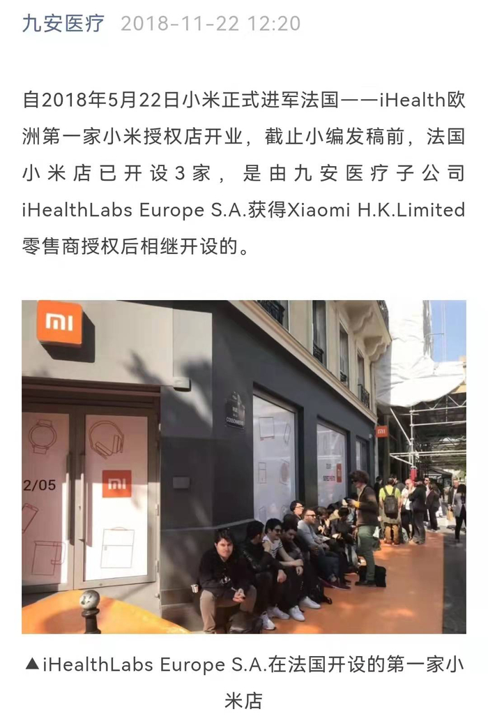 2020年报资料显示,iHealth Inc.是九安医疗与小米公司在移动医疗领域开展战略合作而设立的公司,成立于2015年,九安医疗已将iHealth全球业务调整至iHealth Inc.结构之下。截至2018年3月30日,小米投资本次投资款2500万美元已全部收到,本次增资后,公司持有其80%股权,小米投资持有iHealth Inc.20%股权。