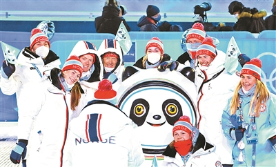 | 2月14日,挪威代表团成员在张家口赛区颁奖广场与“冰墩墩”合影 |