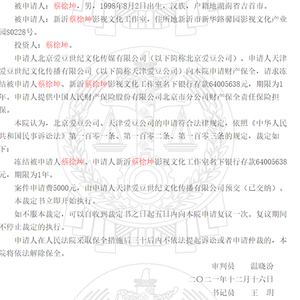 近日,中国裁判文书网显示,爱豆世纪两家公司向法院申请财产保全,请求冻结被申请人蔡徐坤、新沂蔡徐坤影视文化工作室名下银行存款6400万余元,期限为1年。